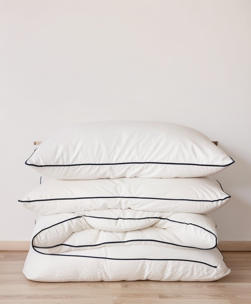| Wykończenie | Zapinane na guziki i wiązane w każdym rogu, aby zabezpieczyć wkładkę. Poszewki na poduszki mają proste zapięcie kopertowe z tyłu pośrodku i wykończone są lamówką w kolorze granatowym. |